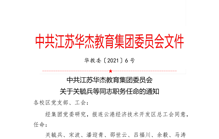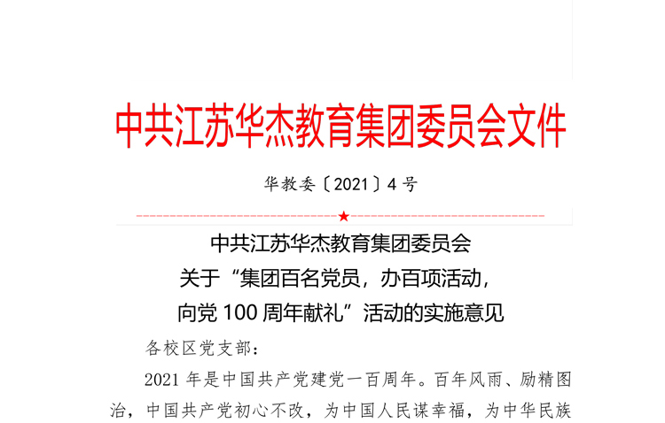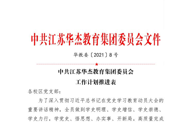 中共江苏华杰教育集团委员会成立于2020年12月15日 集团现有党员126名,预备党员2名,入党积极分子18名。2021年被开发区党工委评为“先进基层党组织”。一、中共江苏华杰教育…