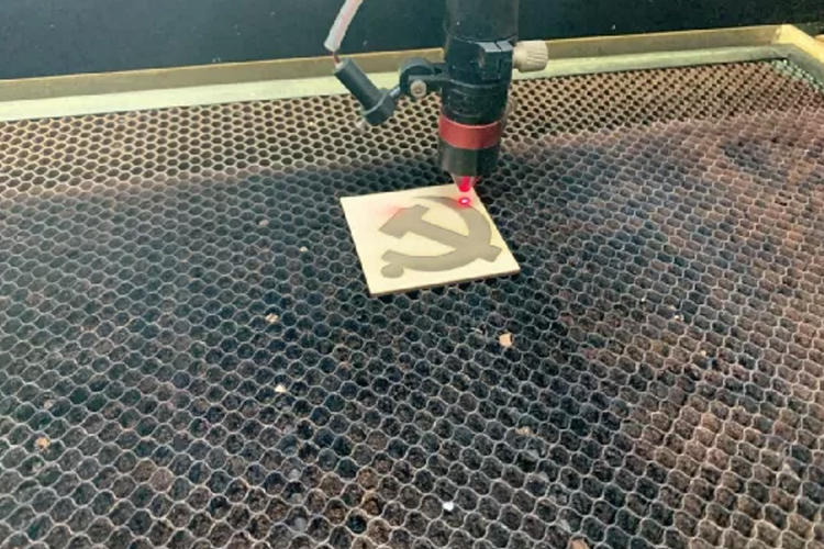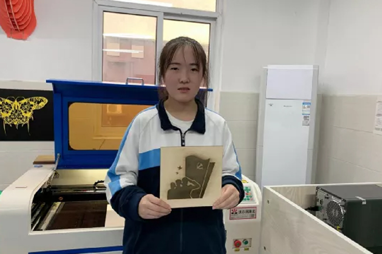 然后,在刘洪朋老师的指导下,同学们将设计好的图案导入电脑,生成激光雕刻文件,并雕刻出来。