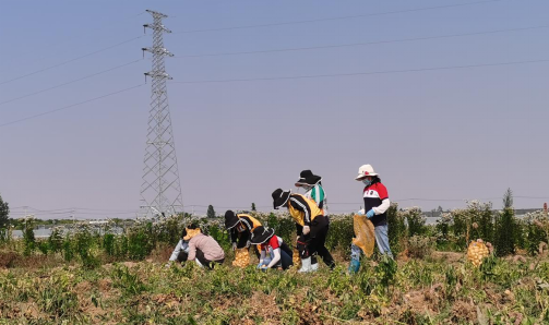 在产业园技术人员的指导下,大家以“三人一组两垄”的形式分组突击,一个撑口袋,两个往袋子里捡拾,“一”字排开,齐头并进。