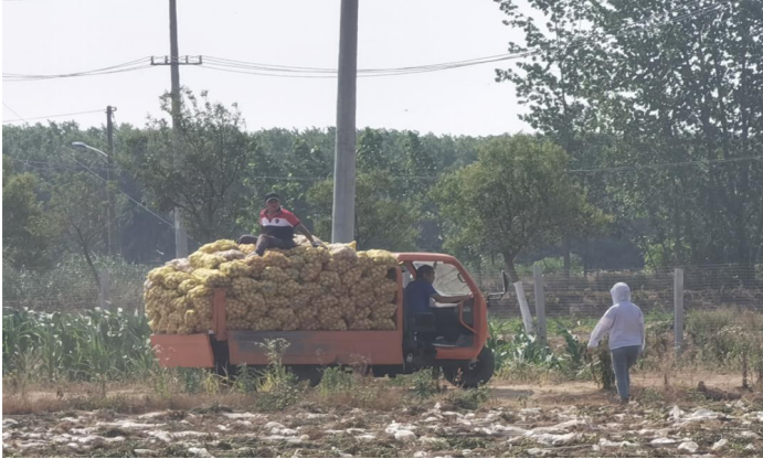 负责运输的采购中心人员及保洁师傅更是独挡一面,他们不仅要把这些装好的土豆一袋袋搬到车上,还要把它们运送到库房再一袋袋搬下来码好。采购人员年轻力壮,发挥着他们运输的特长。保洁师傅老当益壮,码起车来很是在行!