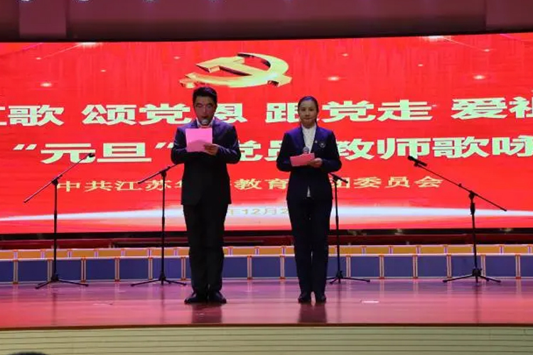 为庆祝中国共产党成立100周年,弘扬爱国主义精神,丰富党员文化生活,营造感党恩、听党话、跟党走的浓厚氛围,江苏华杰教育集团党委于2021年12月23日在连云港华杰实验中学体育馆举行“唱红歌 颂党恩 跟党走”暨庆“元旦”党员教师歌咏赛决赛。
