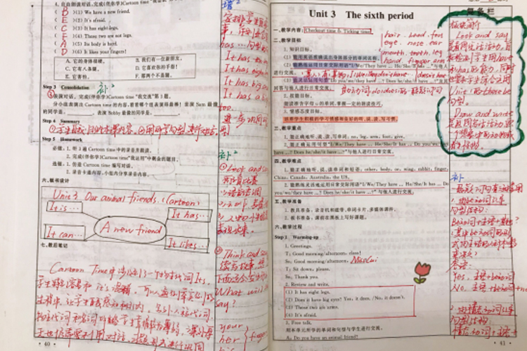“工欲善其事,必先利其器”,教案编写的过程是老师钻研教材、构思教学的过程。一份好的教学设计凝聚着教师对教学的理解和感悟,体现出教师的创新力,呈现出教师对教学思想的追求,闪烁着教师的教学智慧和创造精神。 教案上工整的字迹体现了老师们认真严谨的态度,细致的标注蕴含着老师们思考探索的精神,即时的课后反思展现出老师们对待教学的严谨。