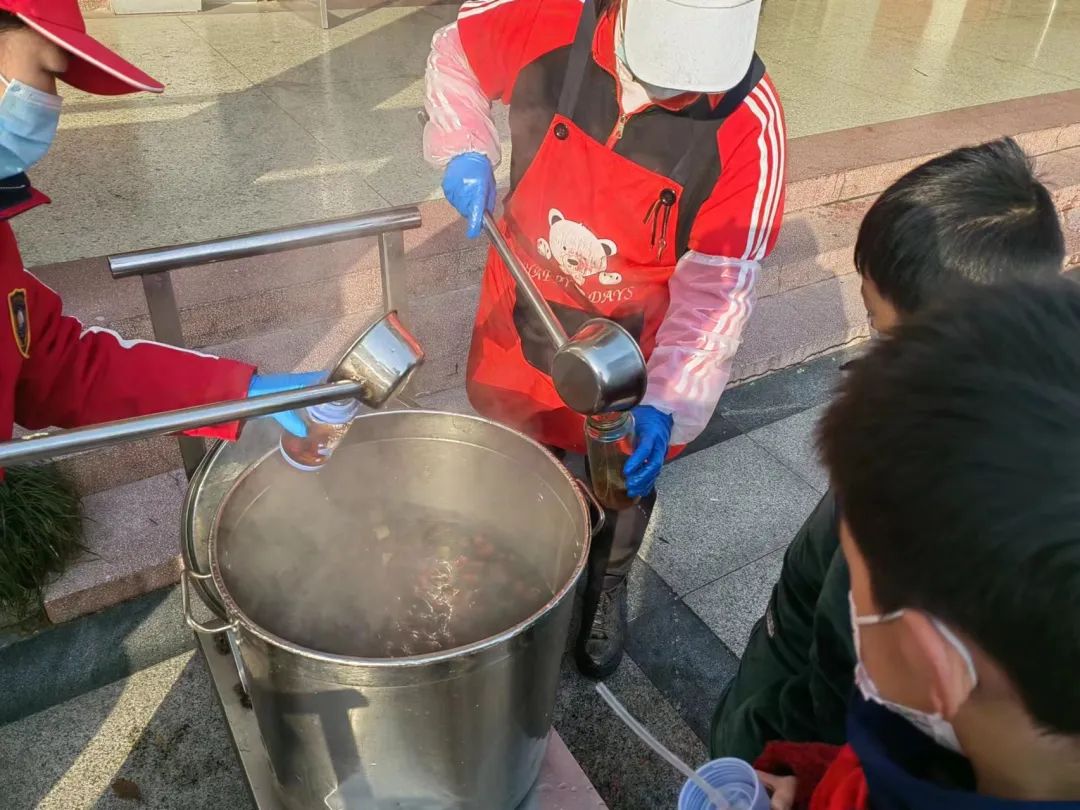 凛冽的寒风挡不住送关怀的脚步,深冬的严寒冷不了一颗颗送温暖的心。为能及时给学生送上热姜茶,食堂职工从清晨就开始忙碌。